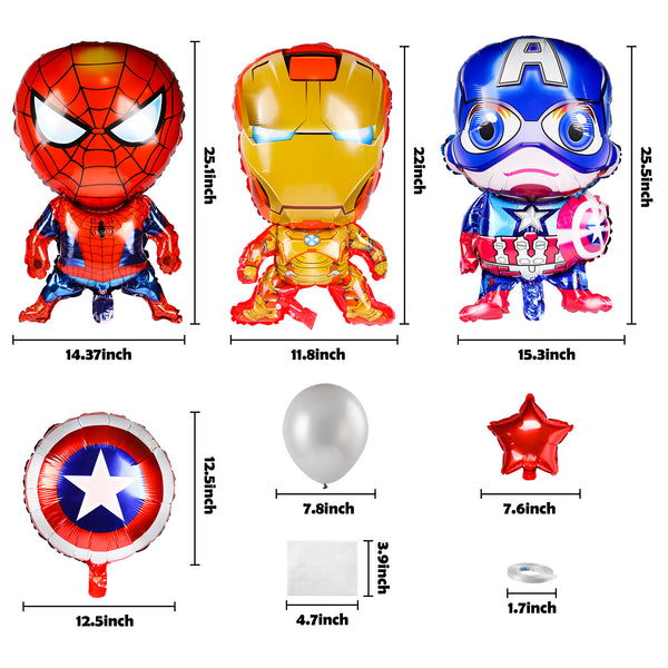 - Value Pack: The package includes 3pcs giant-sized superhero foil balloons, 1pc shield foil balloon, 6pcs star foil balloons in 3 different colors(Blue/Red/Silver), 30pcs latex balloons in 3 different colors(Blue/Red/Silver), 1 volume silver ribbon and 1pc glue point to help with decorating. Totally 40pcs.