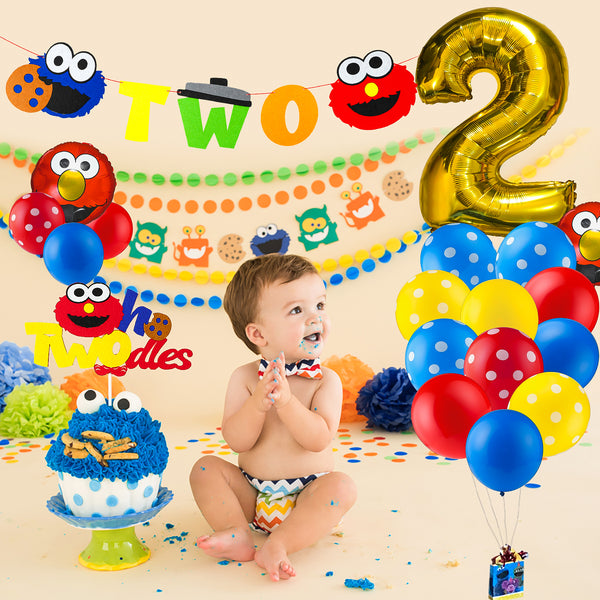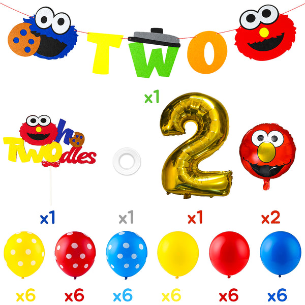 PANTIDE 42Pcs Sesame Birthday Party Decorations Kit - 2nd Elmo Balloons Photo Prop, Sesame Twodles Cake Topper, Elmo Cookie Monster Banner, Great Sesame Theme Party Supplies for Two Year Old Kids
