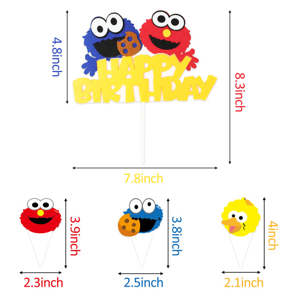 - [Value Sesame Themed Cake & Cupcake Toppers Kit] You will receive 1pc “Happy Birthday” cake topper and 48pcs cupcake toppers in different classic and popular sesame themed figures- Elmo, Cookies Monster, Big Bird, Abby, Grover, Ernie, Oscar, The Count Von Count. Believe such interesting cake toppers will let your cake more unique. If you want to leave your kids special and funny memory, do not hesitate to get it decorate your cake!
