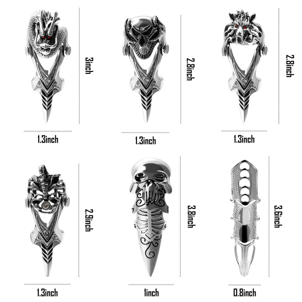 - SPECIAL DESIGN: The 6 rings have different designs, such as skulls, armors, and various animal heads. The unique punk gothic design ring allows you to easily show your personality and become the focus of the crowd!