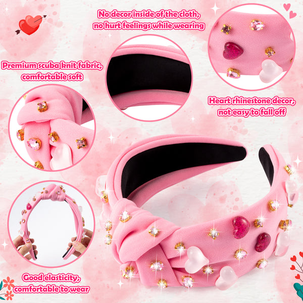 PANTIDE Heart Jeweled Knotted Headband - Valentine's Day Heart Rhinestone CrystalEmbellished Headband Wide Top Knot Fashion Hairband Accessories Christmas Birthday Gift for Women Girls (Pink)